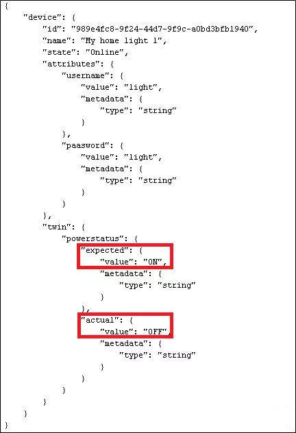 Here you need to use the above mentioned Device Twin. For example, the metadata information of the lamp is described above in Json format, including static attribute attributes and dynamic attribute twin. This defines a twin property called powerstatus, whose expected and actual values can be either ON or OFF. The device itself can report the actual value of the powerstatus to the cloud. The cloud can control the edge side lights to be turned on and off by changing to the expected value of the powerstatus attribute.